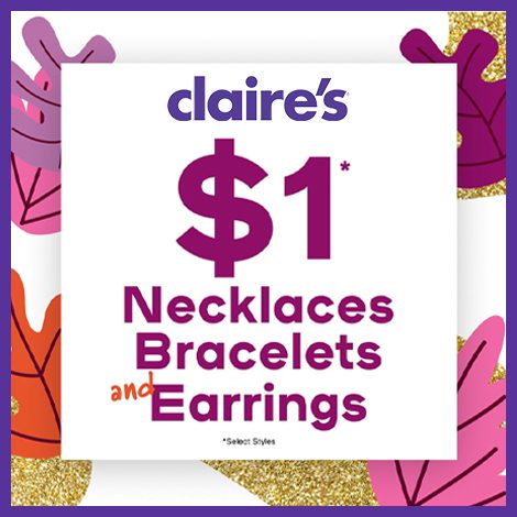 Right now at Claire’s…. select necklaces, bracelets, and earrings are just $1